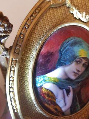 the enamelled portrait roundel on a floral ground with swag and acanthus leaves, fitted with a bevelled mirror verso, raised on tapered uprights and scrolled acanthus-form feet