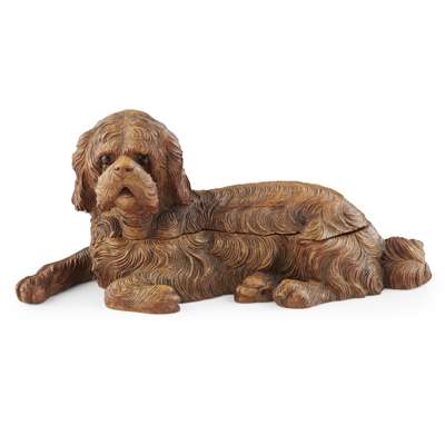 carved as a recumbent dog with glass eyes, the hinged head and back opening to two glass inkwells