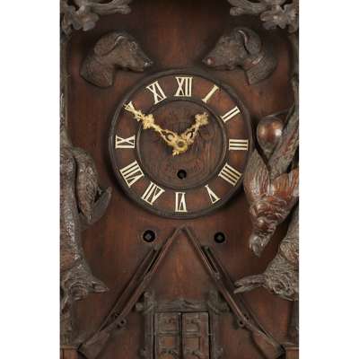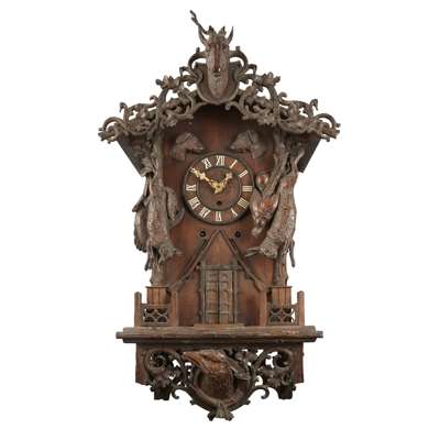LARGE BLACK FOREST CARVED WALL CLOCK BY EMILIAN WEHRLE, RETAILED BY THE MORATH BROTHERS, LIVERPOOL