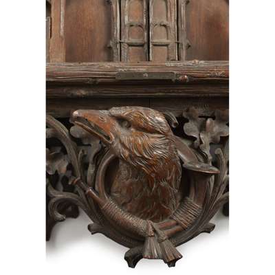 the gabled cornice with scrolling oak branches and leaves and centred by a stag's head, the dial a circular chapter ring with applied Roman numerals and signed MORATH BROTHERS/ LIVERPOOL, with two winding holes and carved hounds' heads and shotguns, flanked by a hanging gamebird, fox and hare, above a pair of carved doors enclosing a pair of trumpeters, and a pierced and carved apron centred by a hunting horn and eagle's head, the movement with six horns and striking a gong