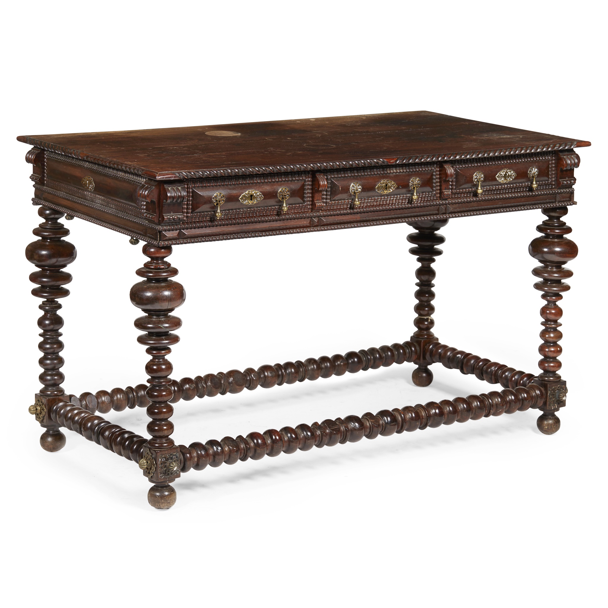 the rectangular top with a gadrooned edge above three cushion moulded frieze drawers, raised on bobbin turned legs joined by peripheral stretchers, on ball feet