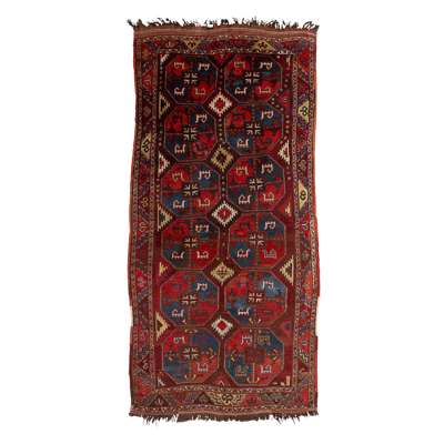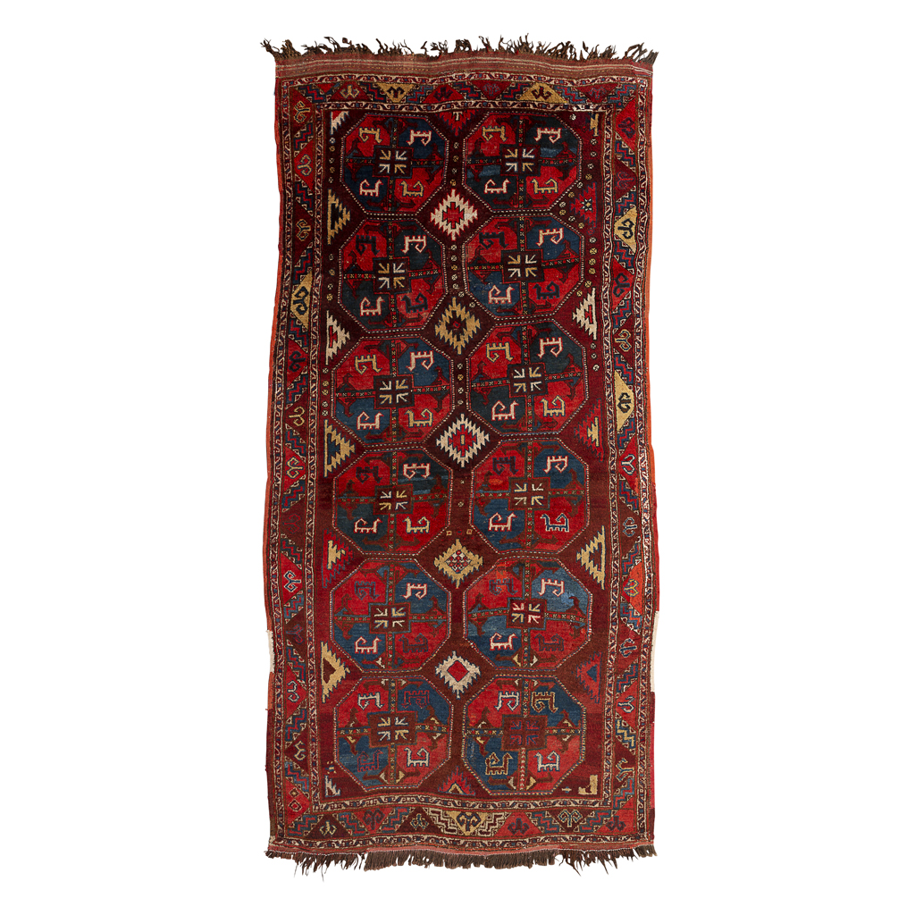the brownish red field with two columns of six guls, within polychrome ram's head pyramid border