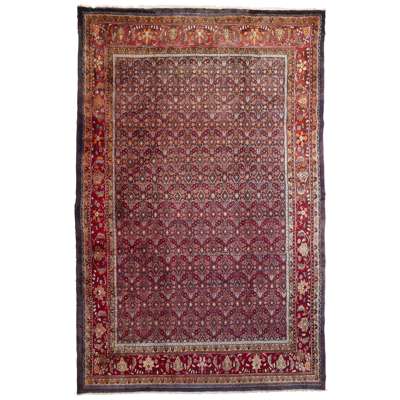 the purple field with allover small lattice pattern, within red palmette and vine border