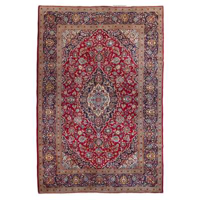 the red field with indigo and ivory medallion, similar spandrels, within indigo palmette and vine border