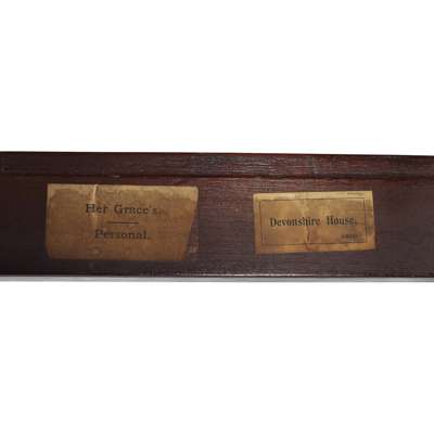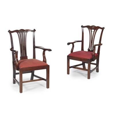 comprising a set of five including one armchair, the backs with carved ears and fan motifs above pierced splats, and another set of five including one armchair, with carved ears and reeded arch moulded top rails above pierced splats, three bearing old labels 'HER GRACE'S PERSONAL' and 'DEVONSHIRE HOUSE'; all with drop-in seats raised on square straight legs joined by stretchers