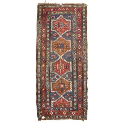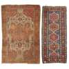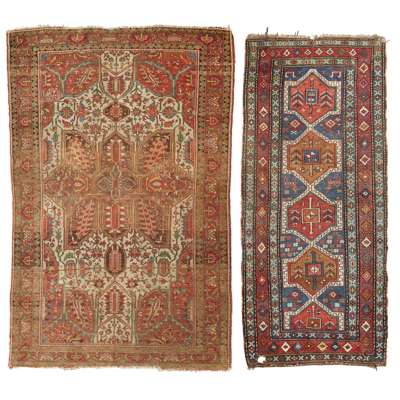 the ivory field with large brown star medallion, red spandrels, within red palmette and vine border; and a SOUTH CAUCASIAN RUG, the blue field with four and a half red and camel lozenge medallions, within red stepped lozenge border
