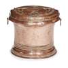 the divided top with strap hinges and embossed with a fleur-de-lis, above a waisted body with ring handles to the sides and a bead moulded base
