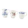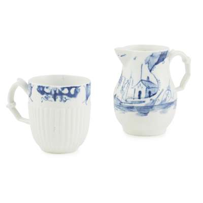 comprising a blue and white sparrowbeak jug decorated with a figure in a boat by a building, painter's numeral, 8cm high; a blue and white coffee cup with ribbed moulding below a rim border, painter's numeral, 6cm high; and a polychrome painted coffee cup with flower sprigs and sprays, 6.5cm high