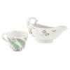 comprising a 'Scolopendrium' moulded and painted cup, typically decorated with leaves and flower sprigs, with label for The Smalle Collection/ South Africa, 6cm high; and a cabbage leaf moulded sauce boat with twig-form handle, decorated with insects and flowers, red painted maker's marks, 18cm across