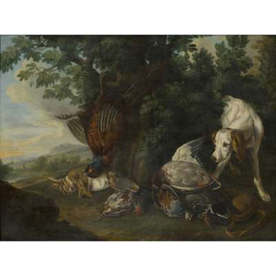 DOG AND DEAD GAME IN A WOODED LANDCSAPE