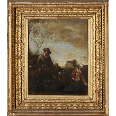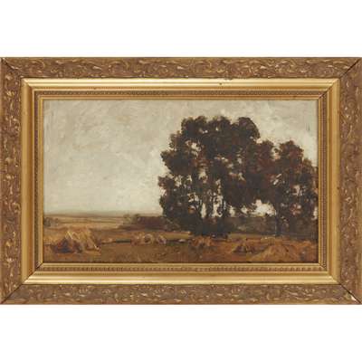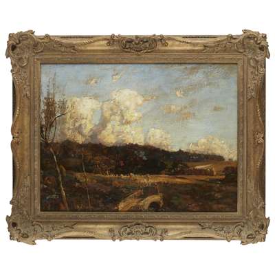 WOODLAND LANDSCAPE WITH PEASANTS MAKING HAY