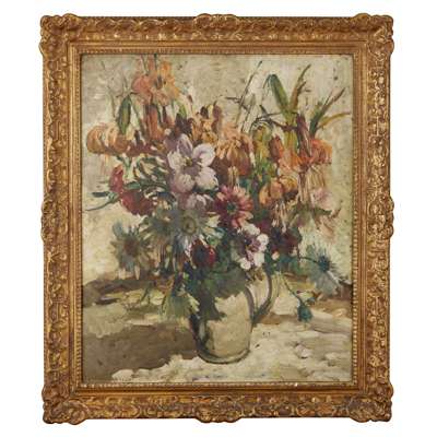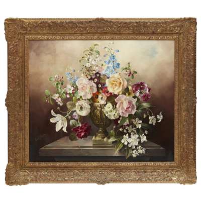 INTERIOR SCENE WITH FLOWERS, FRUIT AND OBJECTS D'ART