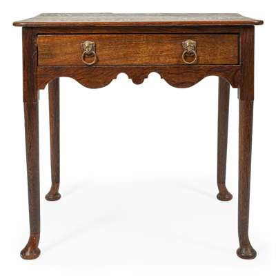the rectangular top over a long frieze drawer with lion mask ring handles, above a shaped apron, raised on tapered legs terminating in pad feet