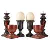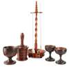 to include a PAIR OF TURNED FRUITWOOD PRICKET CANDLESTICKS; a PAIR OF TURNED URNS WITH OSTRICH EGGS; a PAIR OF RED PAINTED WOOD FOOTED CUPS; a PIPE STAND; a COCONUT CUP; a PAIR OF GOBLETS; and a MORTAR AND PESTLE