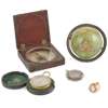 labelled 'JOHNSTONS NEW TERRESTRIAL GLOBE/ PUB BY W & AK JOHNSTON/ 4 ST ANDREWS SQUARE/ EDINBURGH', in a metal meridian ring, globe 7.6cm diameter; together with a MAHOGANY CASED COMPASS, 7cm diameter; a CASED NEGRETTI & ZAMBRA POCKET BAROMETER, 5cm diameter; a SMALL WHITE METAL COMPASS, the case punch decorated with an anchor, 4cm diameter; and a MINIATURE COMPASS, contained within a barrel-form feldspar case, 2cm high