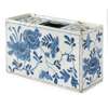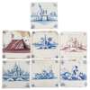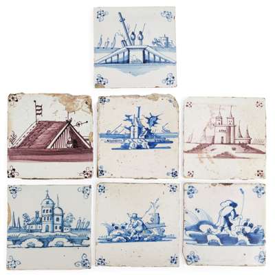 of rectangular form with pierced holes to the top, decorated with flowers and foliage, 15cm wide, 10cm high, 6cm deep; together with a GROUP OF SEVEN DELFT TILES, depicting buildings and figures, five in blue on white and two in manganese, 13cm square approx.