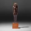 carved wood, shown standing, feet slightly apart, the seperately made arms held to the sides, wearing a tightly fitted sheath dress revealing the form of the body, the wig parted at the forehead and covering the ears and back of the neck, finely carved facial details with subtle smile, raised on a wooden mount