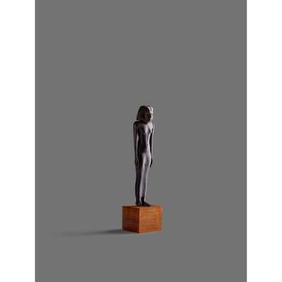 carved wood, shown standing, feet slightly apart, the seperately made arms held to the sides, wearing a tightly fitted sheath dress revealing the form of the body, the wig parted at the forehead and covering the ears and back of the neck, finely carved facial details with subtle smile, raised on a wooden mount