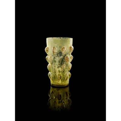 pale green glass, blown in three-part mould with separate base section, standing on a flat base with concentric ring and dot, the body flaring subtly, decorated with five rows of eight almond-shaped “lotus-bud” bosses in relief