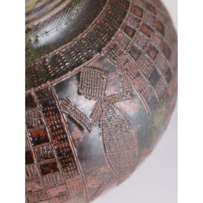 Ladi Kwali is perhaps the most renowned African potter of the last one-hundred years. A pioneer of African ceramic art modernism, she found international acclaim for her works, which melded the traditional skills she had been taught as a child with use of new materials and firing techniques. This resulted in heavier vessels that could no longer function as water storage pots, but rather served as fine art pieces. Kwali's freehand decoration of her works incorporated indigenous motifs of various animals. Beautifully expressive, her works bridge African and Western influences.
