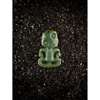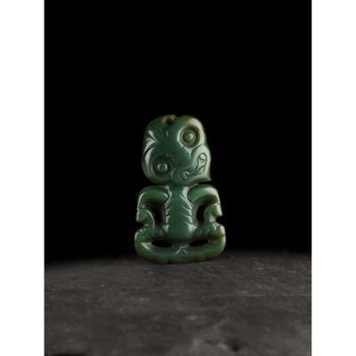 carved and polished inanga pounamu, successive tapering perforation holes, with the original now worn through, the stone fine and quite translucent, with carved features, the head angled with recessed eyes originally for the insertion of shell inlays, the hands shown held to the legs, with two horizontal lozenges indicating the feet
