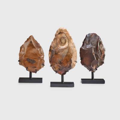 knapped flint, each stone of ovate form, displaying rich caramel hues and raised on a bespoke mount (3)