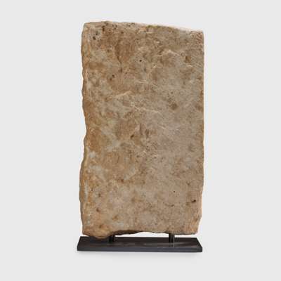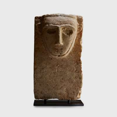 carved limestone, the rectangular stele decorated with a bearded male head in relief, with long slender nose, recessed almond-shaped eyes underneath deep brows and small ears, with remains of an inscription in Sabaean below, raised on a bespoke mount