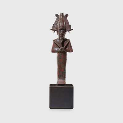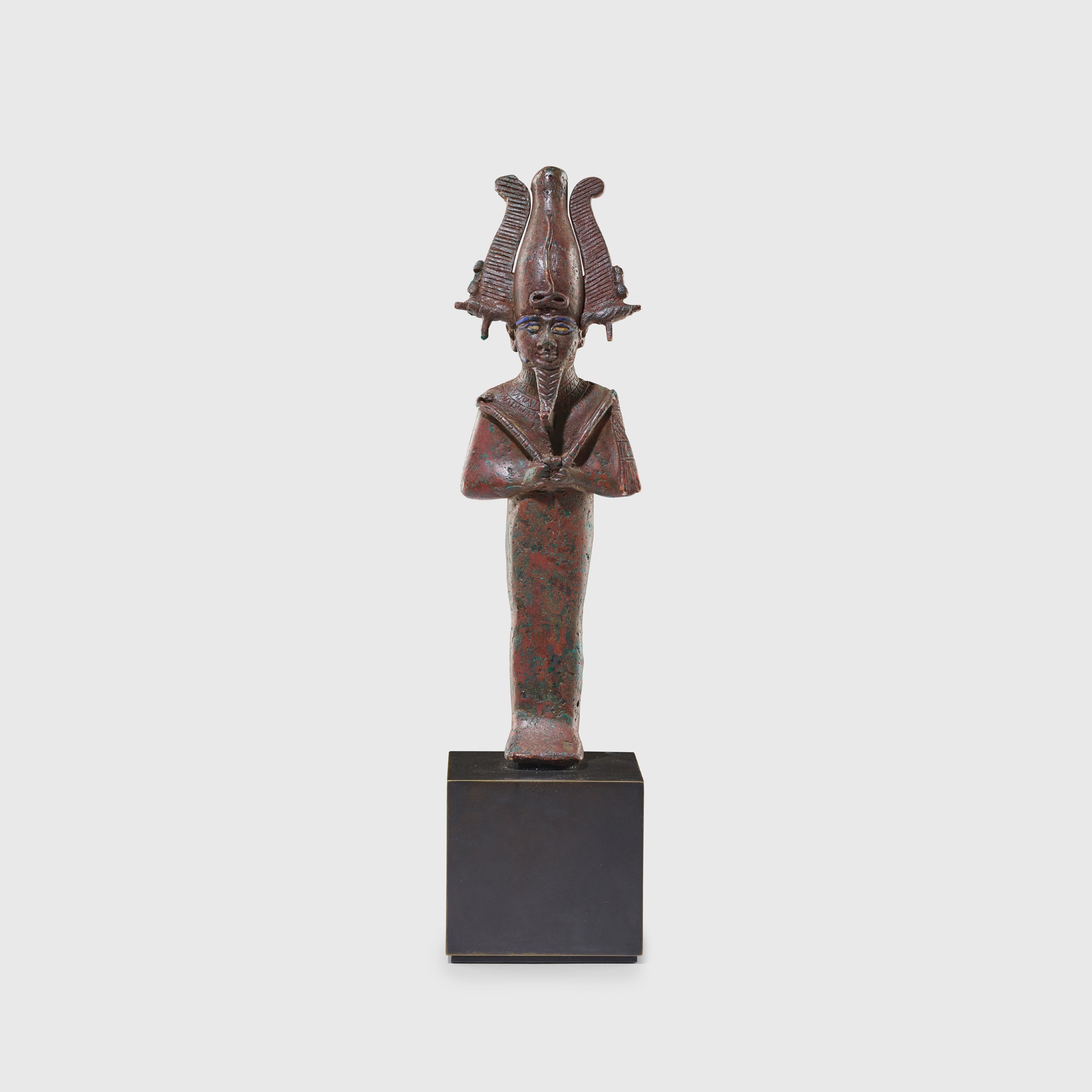 bronze, gold and lapis lazuli, standing deity in typical mummiform pose, holding a crook and flail in his crossed hands, wearing the atef crown with frontal uraeus and incised plaited false beard, the face with inlaid quartz eyes and lapis brows, raised on a bespoke mount