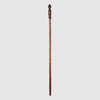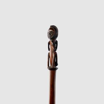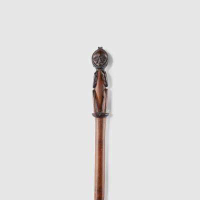 "Seated figures like this one are said to represent royal ancestors. Their use on staff finials underlines the importance Ovimbindu and neighbouring communities like the Chokwe placed on the role works of art could play in signalling and thereby unholding the powers vested in chiefs." Klopper, Nettleton and Pethica, 2007.