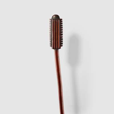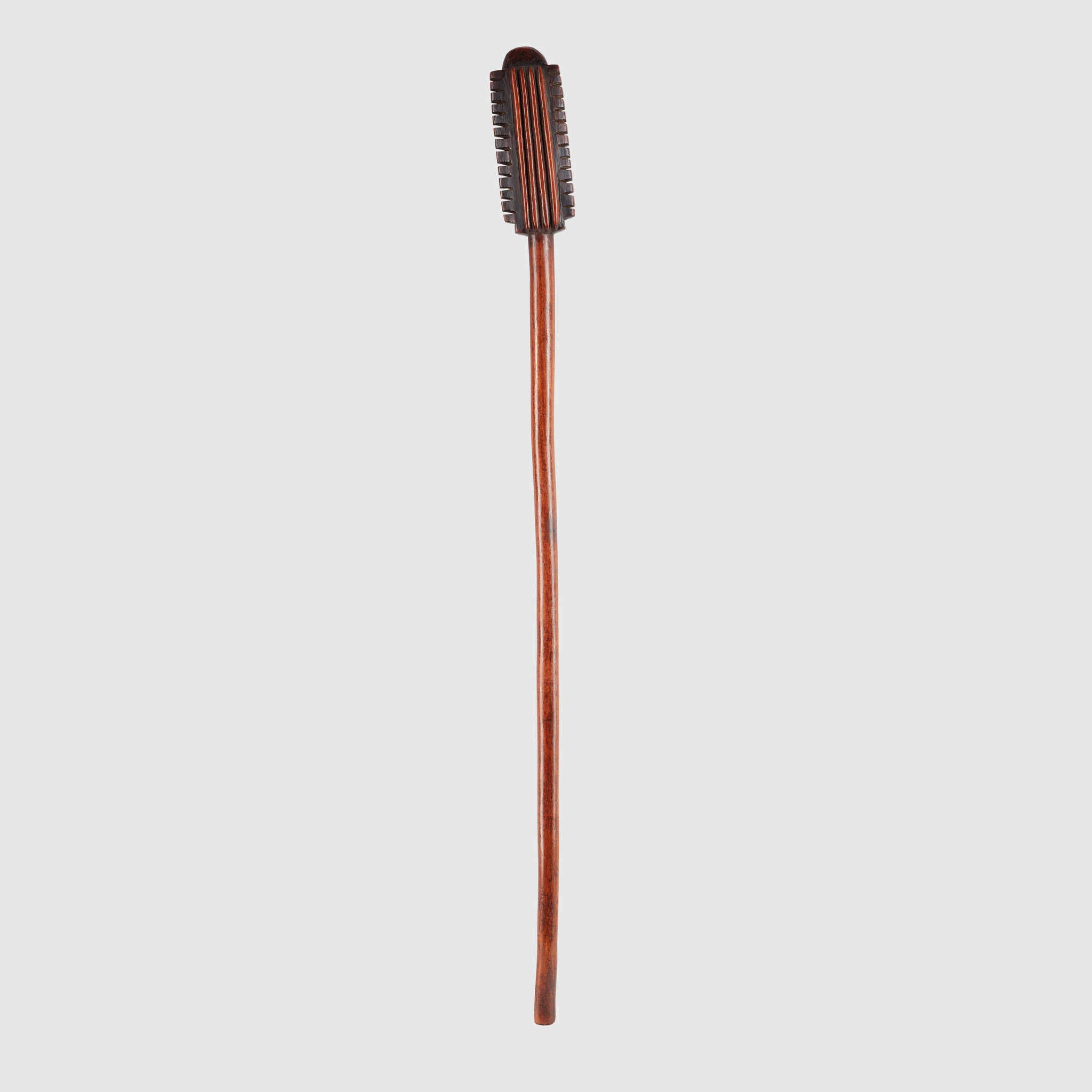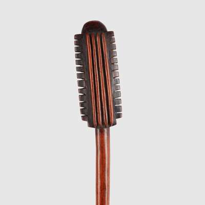 "The slightly off-centre placement of the head of this dance staff imparts a quirky individuality that contributes to the overall vitality of its form. Because staffs like these had to withstand vigorous beatings against small dance shields on festive occasions like weddings and celebrations in honour of ancestors, they were commonly made from hard woods. This also helps to explain why the carving of decorative details like the fluting and zig-zag motifs on this example are fairly robust." Klopper, Nettleton and Pethica, 2007.