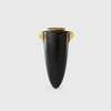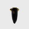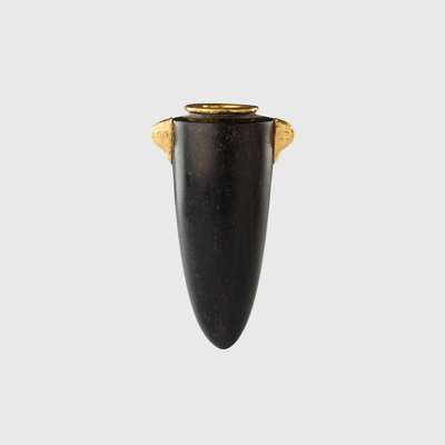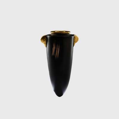 obsidian and gold, the long body curving to a rounded base, with dual lugs below the shoulders overlaid with gold foil, the shoulders horizontal to the body and topped with the dic rim, also overlaid with thin gold sheet, presented on a bespoke mount