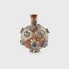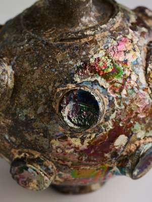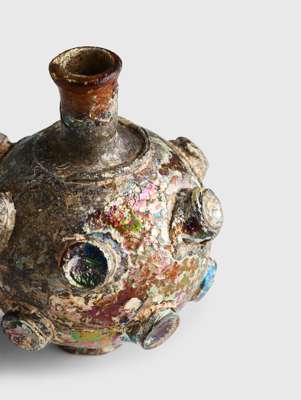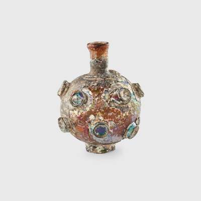 cut and applied glass, bulbous body standing on a disc foot, with thin neck and subtly out-turned rim, the body with applied discs and profuse iridescence