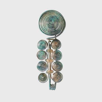 bronze wire, the base of the fibula formed of a single large spiral below a bow with eight smaller lateral spirals, which are attached to the central bow by three cuffs, the head formed into a loop with a quadruple spiral, the reverse with surviving pin