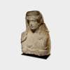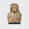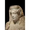 carved limestone, the female figure is shown adorned in a draped attire secured with a fine brooch on her left shoulder, the folds of the garment finely denoted, she is shown facing the viewer with a frontal view, the hair is partially concealed by a headscarf falling across the back, the large almond eyes are marked with incised circles to denote the iris and pupils, the lips slightly pursed, raised on a bespoke mount