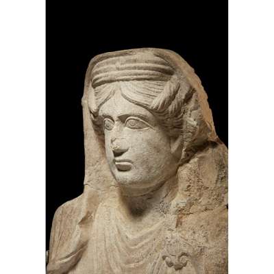 The present piece is a monument that reflects the cultural and economic prosperity of Palmyra, an ancient caravan city in the Near East, during the first three centuries following the birth of Christ. This type of relief, featuring a representation of the deceased accompanied by a brief identification inscription, was typically used to adorn and seal burial niches in highly decorated communal tombs. The half-length or bust format of such reliefs gained in popularity towards the second half of the first century A.D.