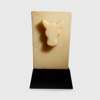 carved alabaster, of trapezoidal form, carved in high relief with a central head of a bull with incised features, raised on a bespoke mount