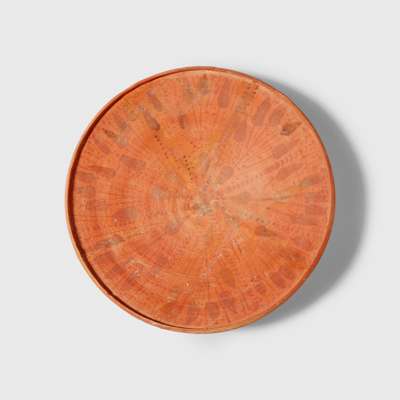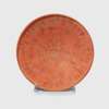 painted terracotta, standing on a rounded base, the shallow walls leading to an inverted rim, of dark red-orange colour and with umber painted vegetal decoration