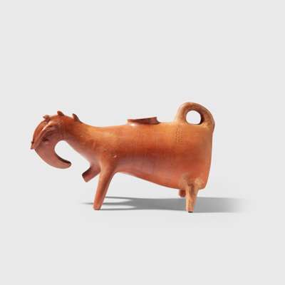 composed of basic geometric forms as a fantastical beast, the cylindrical body with a flat bottom and central opening on top and a spout on the chest, the tail bent up into a handle, with minimal incised linear decoration