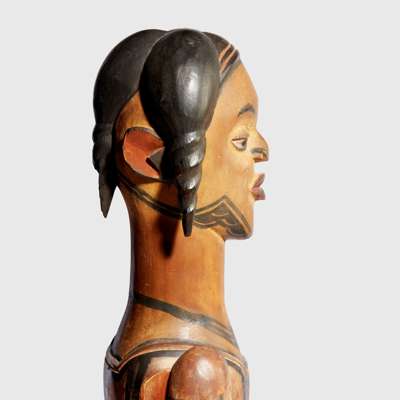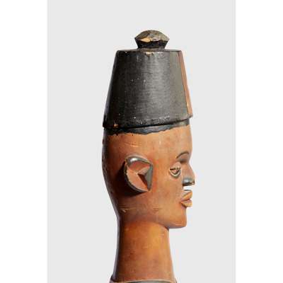 carved wood and pigment, the male figure in the form of a standing policeman with articulated arms and polychrome decoration, the female figure depicting a young lady with deeply-set large eyes, arched brows, prominent nose and an elegant long neck, with a four bunched braid coiffure and wearing a dress that falls below the knees
