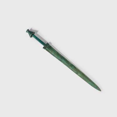 cast bronze, the cotton reel pommel with a flaring base over the tapering rectangular guard with circular and linear stamped decoration, ending in a long blade with dual ridges