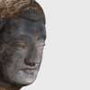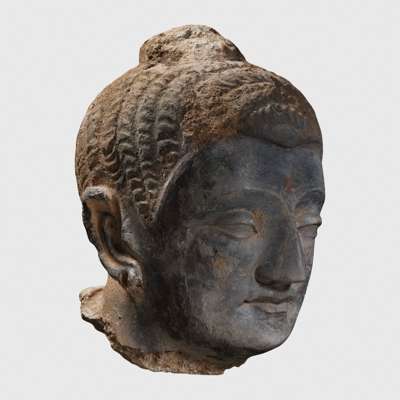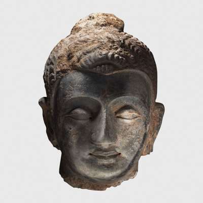 dark grey stucco, Buddha is depicted with a serene countenance, his almond-shaped eyes half closed and mouth set with a gentle smile, the hair rises in waves to form a bun-shaped ushnisha, the earlobes characteristically elongated