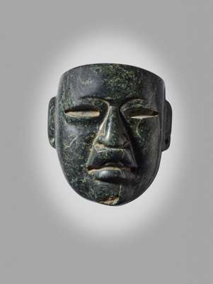 The Olmec civilization, which thrived in the Gulf Coast region of Mexico from approximately 1400 - 400 BC, is renowned for its remarkable artistic achievements, among which serpentine masks such as the present example are particularly noteworthy. Crafted from the distinctive deep green stone, they were characterised by intricate carvings that depicted human visages with exaggerated features, such as downturned mouths, almond-shaped eyes, and broad noses. The masks also incorporated serpentine imagery in the form of coiled snakes or serpent-like figures that surrounded the faces or extended from the top of the masks. It is believed that serpentine masks were utilised in ceremonial and ritual contexts, likely in conjunction with funerary practices or religious festivals, and were probably worn by priests or other elite members of society during these events. The masks also held symbolic value as status symbols, owing to their valuable materials and the skilled craftsmanship required to create them.