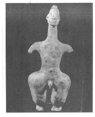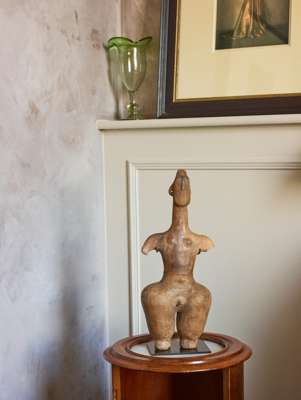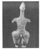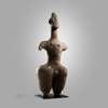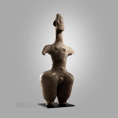 terracotta, a superb, highly stylised standing figure depicted nude, with exaggerated broad hips and short tapering legs, arms curved forward towards the small breasts, elongated neck supporting a globular head with pierced ears, raised on a bespoke mount
