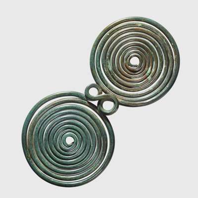 bronze wire, the "spectacle type" fibula formed of two opposing spiralled circular plates joined by a single looped bow, displaying a fine glassy green patination