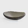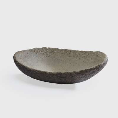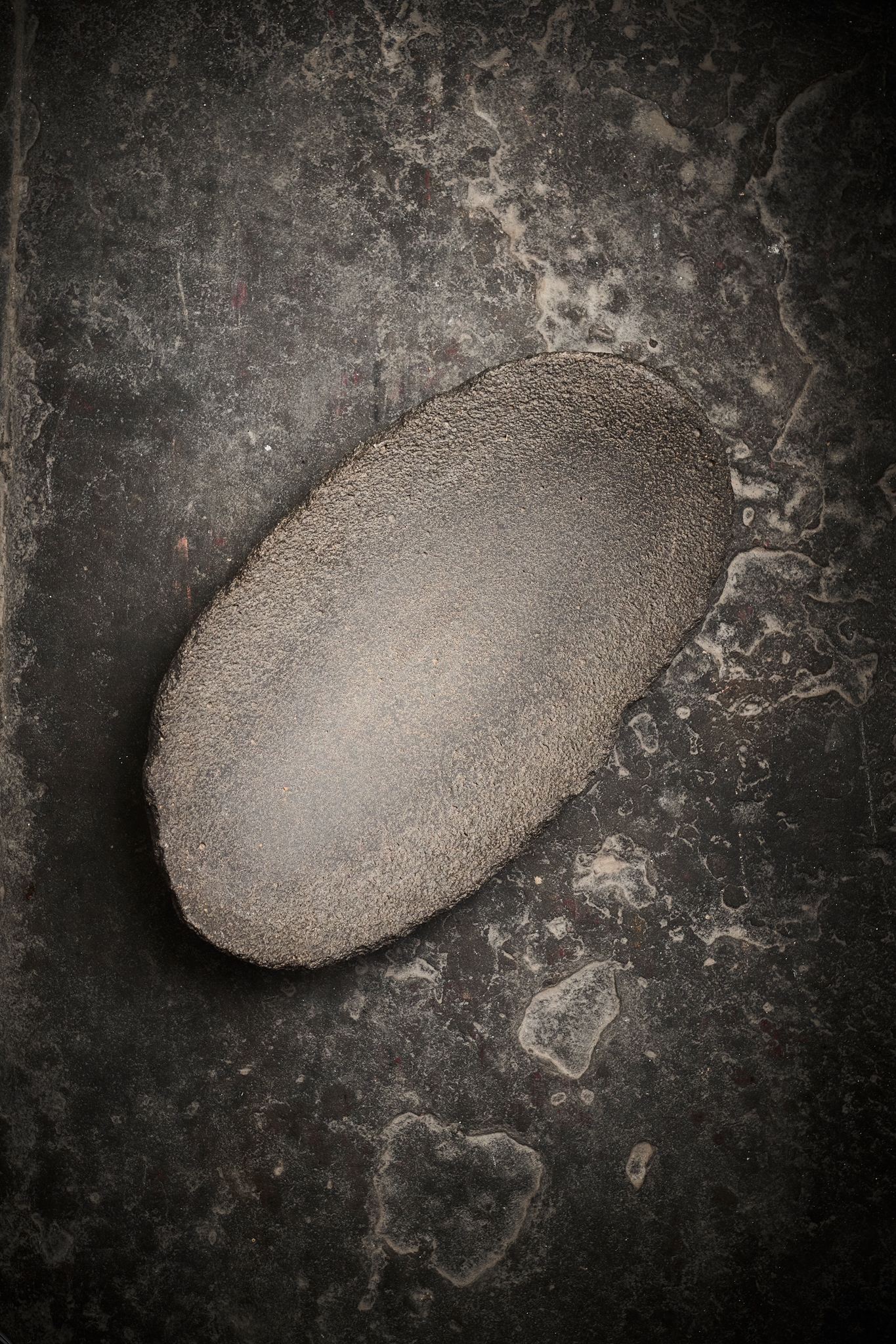 carved volcanic stone, worked into a deep crescent shape over years of use