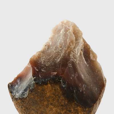 A small proto-biface axe dating to c. 1 million years before the present day; it blurs the line between functionality and artistry, created by an entirely different species of human to ourselves, Homo erectus. While primarily used as a chopping tool, it may also have served as an early core when flake tools were required. It is fashioned from blue-grey stone, displaying subtle variations in tone that highlight its carefully worked form.