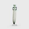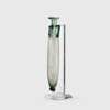 mould blown body, the long body with subtle diagonal ribbing, dark blue strap handles and a dark blue glass applique to the base, raised on a bespoke mount