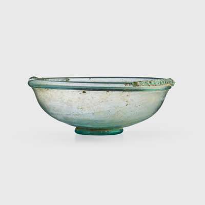 shallow vessel with wide flat base, sloping sides, and splayed lip curving downward, rim with applied vertical tooling forming ridges and grooves creating two small handles, raised circles of glass beneath rim and around base edge, remnants of raised pontil mark on underside