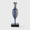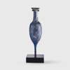 blue glass, featuring a disk lip below an elongated piriform body drawn out and down into a solid pointed foot, raised on a bespoke mount