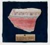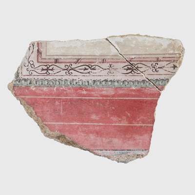 pigment painted on plaster, the fragment depicting the edge of a cream coloured border frame featuring tendrils in umber, a red ground below, accompanied by a 19th / early 20th century label reading “Fresco wall painting. BC 200. From forum in Rome, discovered 1879…”